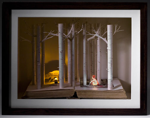 The three sculptures above are by Su Blackwell, an English artist. She often works with fairytales and folk lore and uses subtle color in her diaroma’s.